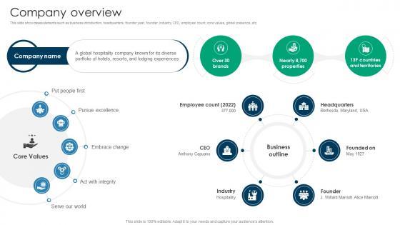 This slide showcases elements such as business introduction, headquarters, founder year, founder, industry, CEO, employee count, core values, global presence, etc. Boost your pitch with our creative Company Overview Premium Hospitality Service Business Model BMC SS V. Deliver an awe-inspiring pitch that will mesmerize everyone. Using these presentation templates you will surely catch everyones attention. You can browse the ppts collection on our website. We have researchers who are experts at creating the right content for the templates. So you do not have to invest time in any additional work. Just grab the template now and use them. This slide showcases elements such as business introduction, headquarters, founder year, founder, industry, CEO, employee count, core values, global presence, etc.