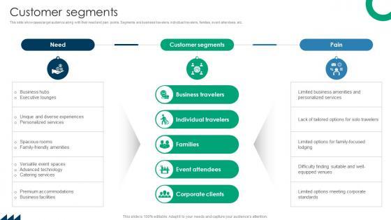 This slide showcases target audience along with their need and pain points. Segments are business travelers, individual travelers, families, event attendees, etc. Want to ace your presentation in front of a live audience Our Customer Segments Premium Hospitality Service Business Model BMC SS V can help you do that by engaging all the users towards you. Slidegeeks experts have put their efforts and expertise into creating these impeccable powerpoint presentations so that you can communicate your ideas clearly. Moreover, all the templates are customizable, and easy-to-edit and downloadable. Use these for both personal and commercial use. This slide showcases target audience along with their need and pain points. Segments are business travelers, individual travelers, families, event attendees, etc.