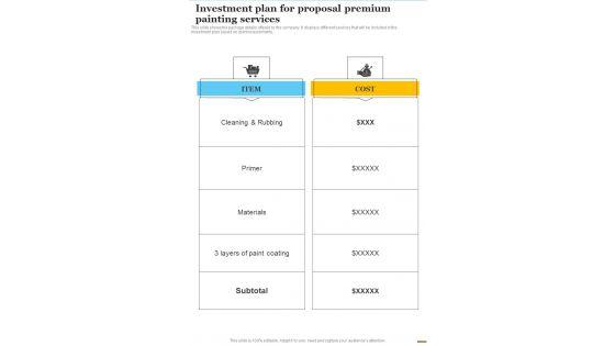 Presenting you an exemplary Investment Plan For Proposal Premium Painting Services One Pager Sample Example Document. Our one-pager comprises all the must-have essentials of an inclusive document. You can edit it with ease, as its layout is completely editable. With such freedom, you can tweak its design and other elements to your requirements. Download this Investment Plan For Proposal Premium Painting Services One Pager Sample Example Document brilliant piece now. Our Investment Plan For Proposal Premium Painting Services One Pager Sample Example Document are topically designed to provide an attractive backdrop to any subject. Use them to look like a presentation pro.