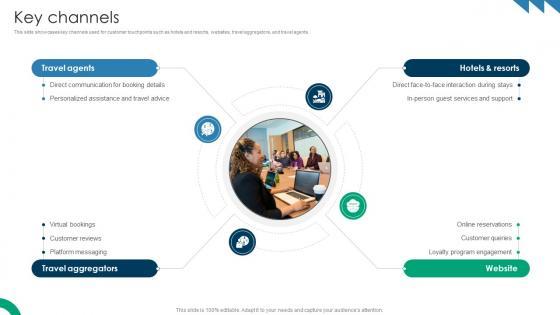 This slide showcases key channels used for customer touchpoints such as hotels and resorts, websites, travel aggregators, and travel agents. From laying roadmaps to briefing everything in detail, our templates are perfect for you. You can set the stage with your presentation slides. All you have to do is download these easy-to-edit and customizable templates. Key Channels Premium Hospitality Service Business Model BMC SS V will help you deliver an outstanding performance that everyone would remember and praise you for. Do download this presentation today. This slide showcases key channels used for customer touchpoints such as hotels and resorts, websites, travel aggregators, and travel agents.