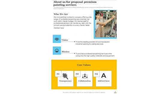 Presenting you an exemplary About Us For Proposal Premium Painting Services One Pager Sample Example Document. Our one-pager comprises all the must-have essentials of an inclusive document. You can edit it with ease, as its layout is completely editable. With such freedom, you can tweak its design and other elements to your requirements. Download this About Us For Proposal Premium Painting Services One Pager Sample Example Document brilliant piece now. Our About Us For Proposal Premium Painting Services One Pager Sample Example Document are topically designed to provide an attractive backdrop to any subject. Use them to look like a presentation pro.