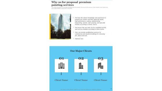 Presenting you an exemplary Why Us For Proposal Premium Painting Services One Pager Sample Example Document. Our one-pager comprises all the must-have essentials of an inclusive document. You can edit it with ease, as its layout is completely editable. With such freedom, you can tweak its design and other elements to your requirements. Download this Why Us For Proposal Premium Painting Services One Pager Sample Example Document brilliant piece now. Our Why Us For Proposal Premium Painting Services One Pager Sample Example Document are topically designed to provide an attractive backdrop to any subject. Use them to look like a presentation pro.