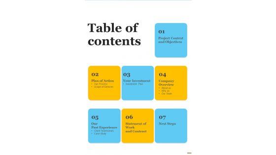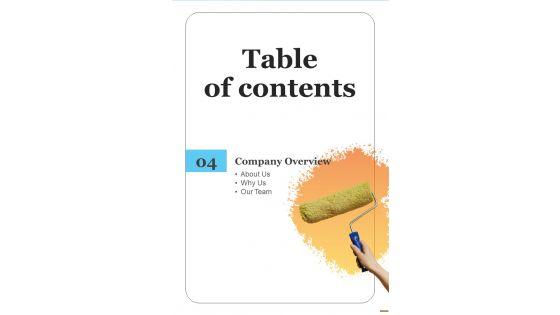 Presenting you an exemplary Table Of Contents Proposal For Premium Painting Services One Pager Sample Example Document. Our one-pager comprises all the must-have essentials of an inclusive document. You can edit it with ease, as its layout is completely editable. With such freedom, you can tweak its design and other elements to your requirements. Download this Table Of Contents Proposal For Premium Painting Services One Pager Sample Example Document brilliant piece now. Our Table Of Contents Proposal For Premium Painting Services One Pager Sample Example Document are topically designed to provide an attractive backdrop to any subject. Use them to look like a presentation pro.