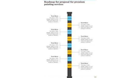 Presenting you an exemplary Roadmap For Proposal For Premium Painting Services One Pager Sample Example Document. Our one-pager comprises all the must-have essentials of an inclusive document. You can edit it with ease, as its layout is completely editable. With such freedom, you can tweak its design and other elements to your requirements. Download this Roadmap For Proposal For Premium Painting Services One Pager Sample Example Document brilliant piece now. Our Roadmap For Proposal For Premium Painting Services One Pager Sample Example Document are topically designed to provide an attractive backdrop to any subject. Use them to look like a presentation pro.