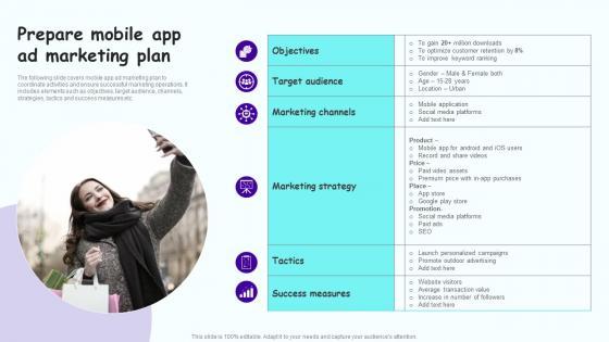 The following slide covers mobile app ad marketing plan to coordinate activities and ensure successful marketing operations. It includes elements such as objectives, target audience, channels, strategies, tactics and success measures etc. Here you can discover an assortment of the finest PowerPoint and Google Slides templates. With these templates, you can create presentations for a variety of purposes while simultaneously providing your audience with an eye catching visual experience. Download Prepare Mobile App Ad Marketing Leveraging Mobile Marketing Strategies Diagrams Pdf to deliver an impeccable presentation. These templates will make your job of preparing presentations much quicker, yet still, maintain a high level of quality. Slidegeeks has experienced researchers who prepare these templates and write high quality content for you. Later on, you can personalize the content by editing the Prepare Mobile App Ad Marketing Leveraging Mobile Marketing Strategies Diagrams Pdf. The following slide covers mobile app ad marketing plan to coordinate activities and ensure successful marketing operations. It includes elements such as objectives, target audience, channels, strategies, tactics and success measures etc.