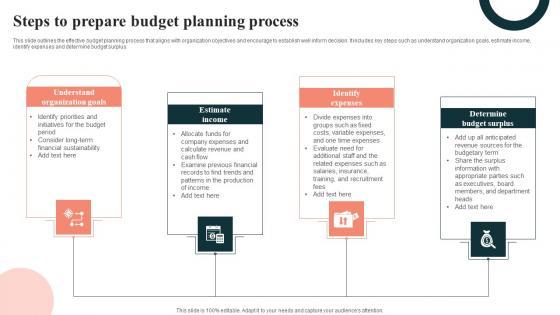This slide outlines the effective budget planning process that aligns with organization objectives and encourage to establish well inform decision. It includes key steps such as understand organization goals, estimate income, identify expenses and determine budget surplus. Showcasing this set of slides titled Steps To Prepare Budget Planning Process Infographics Pdf. The topics addressed in these templates are Estimate Income, Identify Expenses, Determine Budget Surplus. All the content presented in this PPT design is completely editable. Download it and make adjustments in color, background, font etc. as per your unique business setting. This slide outlines the effective budget planning process that aligns with organization objectives and encourage to establish well inform decision. It includes key steps such as understand organization goals, estimate income, identify expenses and determine budget surplus.