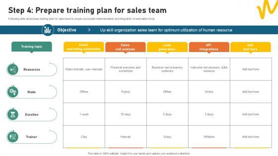 Following slide showcases training plan for sales team to ensure successful implementation and integration of automation tools. Do you know about Slidesgeeks Step 4 Prepare Training Plan For Sample Pitch Deck For Video Ppt Presentation These are perfect for delivering any kind od presentation. Using it, create PowerPoint presentations that communicate your ideas and engage audiences. Save time and effort by using our pre-designed presentation templates that are perfect for a wide range of topic. Our vast selection of designs covers a range of styles, from creative to business, and are all highly customizable and easy to edit. Download as a PowerPoint template or use them as Google Slides themes. Following slide showcases training plan for sales team to ensure successful implementation and integration of automation tools.
