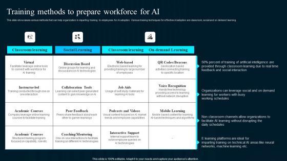 This slide showcases various methods that can help organization in imparting training to employees for AI adoption. Various training techniques for effective AI adoption are classroom, social and on demand learning. Coming up with a presentation necessitates that the majority of the effort goes into the content and the message you intend to convey. The visuals of a PowerPoint presentation can only be effective if it supplements and supports the story that is being told. Keeping this in mind our experts created Training Methods To Prepare Workforce For AI Ideas Pdf to reduce the time that goes into designing the presentation. This way, you can concentrate on the message while our designers take care of providing you with the right template for the situation. This slide showcases various methods that can help organization in imparting training to employees for AI adoption. Various training techniques for effective AI adoption are classroom, social and on demand learning.