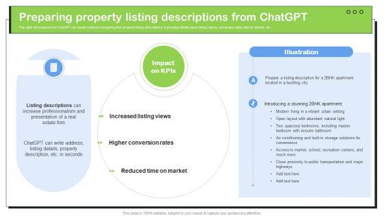 This slide showcases how ChatGPT can assist realtors in preparing their property listing descriptions. It provides details about listing views, conversion rates, time on market, etc. Slidegeeks is one of the best resources for PowerPoint templates. You can download easily and regulate Transforming Real Estate Preparing Property Listing Descriptions From ChatGPT SS V for your personal presentations from our wonderful collection. A few clicks is all it takes to discover and get the most relevant and appropriate templates. Use our Templates to add a unique zing and appeal to your presentation and meetings. All the slides are easy to edit and you can use them even for advertisement purposes. This slide showcases how ChatGPT can assist realtors in preparing their property listing descriptions. It provides details about listing views, conversion rates, time on market, etc.