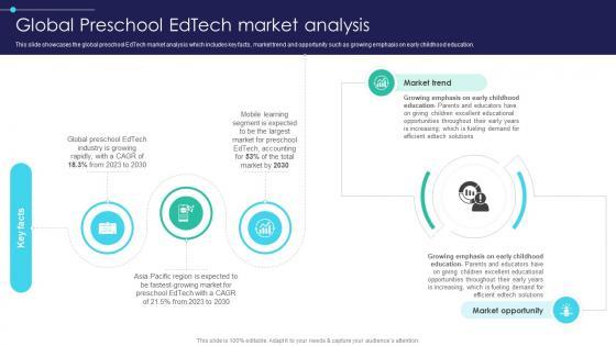 This slide showcases the global preschool EdTech market analysis which includes key facts, market trend and opportunity such as growing emphasis on early childhood education. This modern and well-arranged Global Digital Education Global Preschool Edtech Market Analysis IR SS V provides lots of creative possibilities. It is very simple to customize and edit with the Powerpoint Software. Just drag and drop your pictures into the shapes. All facets of this template can be edited with Powerpoint, no extra software is necessary. Add your own material, put your images in the places assigned for them, adjust the colors, and then you can show your slides to the world, with an animated slide included. This slide showcases the global preschool EdTech market analysis which includes key facts, market trend and opportunity such as growing emphasis on early childhood education.