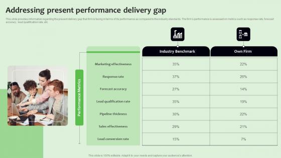 This slide provides information regarding the present delivery gap that firm is facing in terms of its performance as compared to the industry standards. The firms performance is assessed on metrics such as response rate, forecast accuracy, lead qualification rate, etc. Deliver and pitch your topic in the best possible manner with this Addressing Present Performance Delivery Gap Improving Distribution Channel Download PDF. Use them to share invaluable insights on Marketing Effectiveness, Forecast Accuracy, Sales Effectiveness and impress your audience. This template can be altered and modified as per your expectations. So, grab it now.