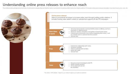This slide provides glimpse about summary of online press releases that can help the bakery business for increasing online reach of our target audience. It includes online press release description, how does it work, pros, cons, etc.Boost your pitch with our creative Understanding Online Press Releases To Enhance Reach Strategic Advertising Plan For Bakehouse Graphics Pdf. Deliver an awe inspiring pitch that will mesmerize everyone. Using these presentation templates you will surely catch everyones attention. You can browse the ppts collection on our website. We have researchers who are experts at creating the right content for the templates. So you do not have to invest time in any additional work. Just grab the template now and use them. This slide provides glimpse about summary of online press releases that can help the bakery business for increasing online reach of our target audience. It includes online press release description, how does it work, pros, cons, etc.
