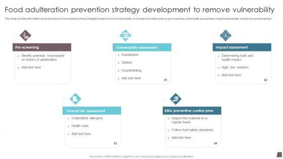 This slide provide information about procedure to formulate food fraud mitigation plan to remove vulnerability. It includes elements such as pre-screening, vulnerability assessment, impact assessment, overall risk assessment etc. Showcasing this set of slides titled Food Adulteration Prevention Strategy Development To Remove Vulnerability Designs Pdf. The topics addressed in these templates are Vulnerability Assessment, Risk Assessment, Control Plan. All the content presented in this PPT design is completely editable. Download it and make adjustments in color, background, font etc. as per your unique business setting. This slide provide information about procedure to formulate food fraud mitigation plan to remove vulnerability. It includes elements such as pre-screening, vulnerability assessment, impact assessment, overall risk assessment etc.