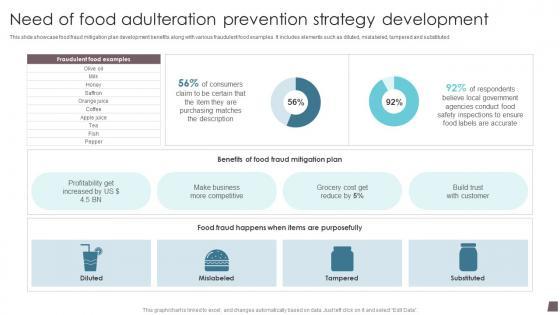 This slide showcase food fraud mitigation plan development benefits along with various fraudulent food examples. It includes elements such as diluted, mislabeled, tampered and substituted Showcasing this set of slides titled Need Of Food Adulteration Prevention Strategy Development Guidelines Pdf. The topics addressed in these templates are Development, Competitive, Accurate. All the content presented in this PPT design is completely editable. Download it and make adjustments in color, background, font etc. as per your unique business setting. This slide showcase food fraud mitigation plan development benefits along with various fraudulent food examples. It includes elements such as diluted, mislabeled, tampered and substituted