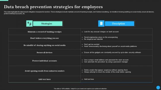 This slide highlights the data breach mitigation measures for workers. These strategies include maintain a record of banking receipts, dont believe everything, be mindful of sharing anything on social media, secure all devices, protect individual accounts, etc. Make sure to capture your audiences attention in your business displays with our gratis customizable Data Breach Prevention Strategies For Employees Data Breach Prevention Topics Pdf. These are great for business strategies, office conferences, capital raising or task suggestions. If you desire to acquire more customers for your tech business and ensure they stay satisfied, create your own sales presentation with these plain slides. This slide highlights the data breach mitigation measures for workers. These strategies include maintain a record of banking receipts, dont believe everything, be mindful of sharing anything on social media, secure all devices, protect individual accounts, etc.