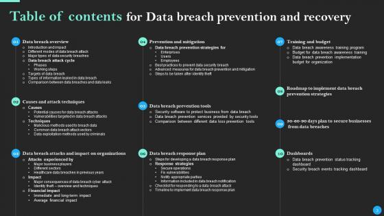 Get a simple yet stunning designed Table Of Contents For Data Breach Prevention And Recovery Brochure Pdf. It is the best one to establish the tone in your meetings. It is an excellent way to make your presentations highly effective. So, download this PPT today from Slidegeeks and see the positive impacts. Our easy-to-edit Table Of Contents For Data Breach Prevention And Recovery Brochure Pdf can be your go-to option for all upcoming conferences and meetings. So, what are you waiting for Grab this template today. Our Table Of Contents For Data Breach Prevention And Recovery Brochure Pdf are topically designed to provide an attractive backdrop to any subject. Use them to look like a presentation pro.