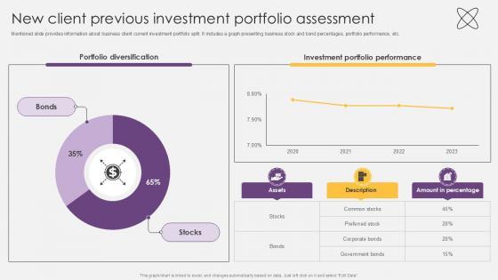 Mentioned slide provides information about business client current investment portfolio split.It includes a graph presenting business stock and bond percentages, portfolio performance, etc. This New Client Previous Investment Portfolio Assessment Investment Fund PPT Example from Slidegeeks makes it easy to present information on your topic with precision. It provides customization options, so you can make changes to the colors, design, graphics, or any other component to create a unique layout. It is also available for immediate download, so you can begin using it right away. Slidegeeks has done good research to ensure that you have everything you need to make your presentation stand out. Make a name out there for a brilliant performance. Mentioned slide provides information about business client current investment portfolio split.It includes a graph presenting business stock and bond percentages, portfolio performance, etc.