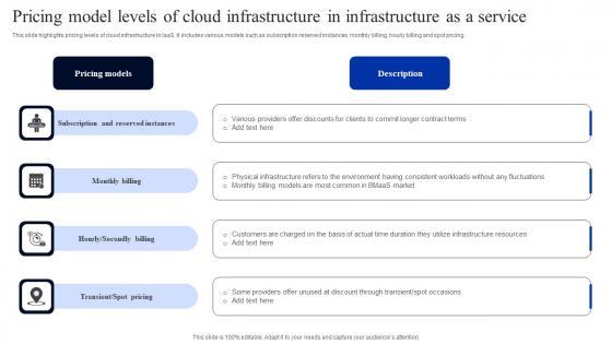 This slide highlights pricing levels of cloud infrastructure in IaaS. It includes various models such as subscription reserved instances, monthly billing, hourly billing and spot pricing. Pitch your topic with ease and precision using this Pricing Model Levels Of Cloud Infrastructure In Infrastructure As A Service Summary Pdf. This layout presents information on Monthly Billing, Hourly Billing, Spot Pricing. It is also available for immediate download and adjustment. So, changes can be made in the color, design, graphics or any other component to create a unique layout. This slide highlights pricing levels of cloud infrastructure in IaaS. It includes various models such as subscription reserved instances, monthly billing, hourly billing and spot pricing.