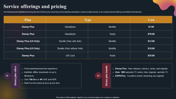 The following slide highlights the pricing structure of Disney plus streaming service depicting standalone, bundle and gift card plan. It also depicts Special offerings and details of bundle plan. This Service Offerings And Pricing OTT Platform Company Outline Slides Pdf is perfect for any presentation, be it in front of clients or colleagues. It is a versatile and stylish solution for organizing your meetings. The Service Offerings And Pricing OTT Platform Company Outline Slides Pdf features a modern design for your presentation meetings. The adjustable and customizable slides provide unlimited possibilities for acing up your presentation. Slidegeeks has done all the homework before launching the product for you. So, do not wait, grab the presentation templates today The following slide highlights the pricing structure of Disney plus streaming service depicting standalone, bundle and gift card plan. It also depicts Special offerings and details of bundle plan.