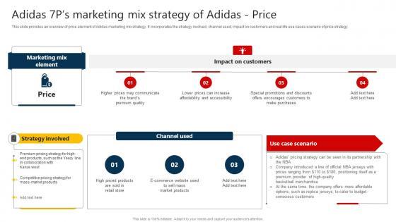 This slide provides an overview of price element of Adidas marketing mix strategy. It incorporates the strategy involved, channel used, impact on customers and real life use cases scenario of price strategy. Create an editable Adidas 7ps Marketing Mix Strategy Of Adidas Price Strategy SS V that communicates your idea and engages your audience. Whether you are presenting a business or an educational presentation, pre-designed presentation templates help save time. Adidas 7ps Marketing Mix Strategy Of Adidas Price Strategy SS V is highly customizable and very easy to edit, covering many different styles from creative to business presentations. Slidegeeks has creative team members who have crafted amazing templates. So, go and get them without any delay. This slide provides an overview of price element of Adidas marketing mix strategy. It incorporates the strategy involved, channel used, impact on customers and real life use cases scenario of price strategy.