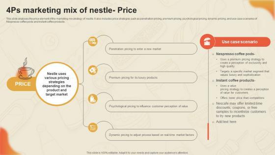 This slide analyses the price element of the marketing mix strategy of nestle. It also includes price strategies such as penetration pricing, premium pricing, psychological pricing, dynamic pricing, and use case scenarios of Nespresso coffee pods and instant coffee products. Coming up with a presentation necessitates that the majority of the effort goes into the content and the message you intend to convey. The visuals of a PowerPoint presentation can only be effective if it supplements and supports the story that is being told. Keeping this in mind our experts created Comprehensive Review Of Nestles Marketing 4ps Marketing Mix Of Nestle Price Strategy SS V to reduce the time that goes into designing the presentation. This way, you can concentrate on the message while our designers take care of providing you with the right template for the situation. This slide analyses the price element of the marketing mix strategy of nestle. It also includes price strategies such as penetration pricing, premium pricing, psychological pricing, dynamic pricing, and use case scenarios of Nespresso coffee pods and instant coffee products.