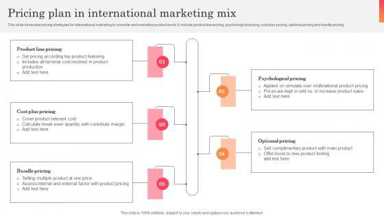 This slide showcase pricing strategies for international marketing to consider and marketize product world. It include product line pricing, psychological pricing, cost plus pricing, optional pricing and bundle pricing. Pitch your topic with ease and precision using this Pricing Plan In International Marketing Mix Icons Pdf. This layout presents information on Product Line Pricing, Psychological Pricing, Optional Pricing, Bundle Pricing . It is also available for immediate download and adjustment. So, changes can be made in the color, design, graphics or any other component to create a unique layout. This slide showcase pricing strategies for international marketing to consider and marketize product world. It include product line pricing, psychological pricing, cost plus pricing, optional pricing and bundle pricing.