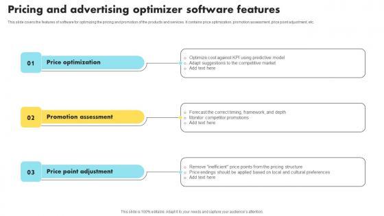 This slide covers the features of software for optimizing the pricing and promotion of the products and services. It contains price optimization, promotion assessment, price point adjustment, etc.Pitch your topic with ease and precision using this Pricing And Advertising Optimizer Software Features Guidelines Pdf This layout presents information on Promotion Assessment, Price Optimization, Price Point Adjustment It is also available for immediate download and adjustment. So, changes can be made in the color, design, graphics or any other component to create a unique layout. This slide covers the features of software for optimizing the pricing and promotion of the products and services. It contains price optimization, promotion assessment, price point adjustment, etc.