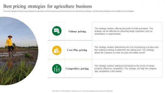 This slide highlights the top pricing strategies for agriculture and farming business which include volume based pricing strategies, cost plus pricing strategies and competitive pricing strategies. Slidegeeks is one of the best resources for PowerPoint templates. You can download easily and regulate Agriculture Business Plan Go To Market Strategy Best Pricing Strategies Agriculture Mockup Pdf for your personal presentations from our wonderful collection. A few clicks is all it takes to discover and get the most relevant and appropriate templates. Use our Templates to add a unique zing and appeal to your presentation and meetings. All the slides are easy to edit and you can use them even for advertisement purposes. This slide highlights the top pricing strategies for agriculture and farming business which include volume based pricing strategies, cost plus pricing strategies and competitive pricing strategies.