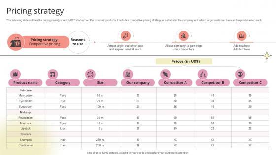 The following slide outlines the pricing strategy used by B2C start-up to offer cosmetic products. It includes competitive pricing strategy as suitable for the company as it attract larger customer base and expand market reach.Formulating a presentation can take up a lot of effort and time, so the content and message should always be the primary focus. The visuals of the PowerPoint can enhance the presenters message, so our Pricing Strategy Beauty Product Company Go To Market Strategy GTM SS V was created to help save time. Instead of worrying about the design, the presenter can concentrate on the message while our designers work on creating the ideal templates for whatever situation is needed. Slidegeeks has experts for everything from amazing designs to valuable content, we have put everything into Pricing Strategy Beauty Product Company Go To Market Strategy GTM SS V. The following slide outlines the pricing strategy used by B2C start-up to offer cosmetic products. It includes competitive pricing strategy as suitable for the company as it attract larger customer base and expand market reach.