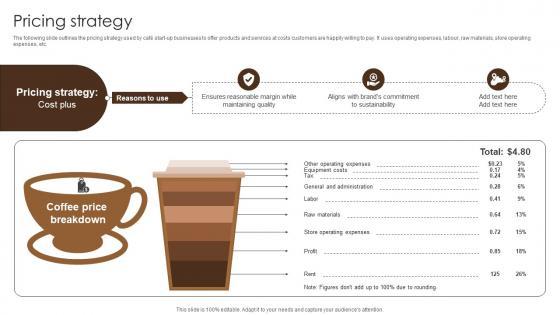 The following slide outlines the pricing strategy used by cafe start-up businesses to offer products and services at costs customers are happily willing to pay. It uses operating expenses, labour, raw materials, store operating expenses, etc.The best PPT templates are a great way to save time, energy, and resources. Slidegeeks have 100 percent editable powerpoint slides making them incredibly versatile. With these quality presentation templates, you can create a captivating and memorable presentation by combining visually appealing slides and effectively communicating your message. Download Pricing Strategy Coffee Bar Go To Market Strategy GTM SS V from Slidegeeks and deliver a wonderful presentation. The following slide outlines the pricing strategy used by cafe start-up businesses to offer products and services at costs customers are happily willing to pay. It uses operating expenses, labour, raw materials, store operating expenses, etc.