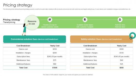 The following slide outlines the pricing strategy used by smart home automation startup to offer products and services at costs customers are happily willing to pay. It uses device cost, installation charges, subscription fees, etc.The Pricing Strategy Domotics Go To Market Strategy GTM SS V is a compilation of the most recent design trends as a series of slides. It is suitable for any subject or industry presentation, containing attractive visuals and photo spots for businesses to clearly express their messages. This template contains a variety of slides for the user to input data, such as structures to contrast two elements, bullet points, and slides for written information. Slidegeeks is prepared to create an impression. The following slide outlines the pricing strategy used by smart home automation startup to offer products and services at costs customers are happily willing to pay. It uses device cost, installation charges, subscription fees, etc.