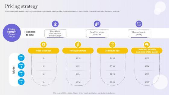 The following slide outlines the pricing strategy used by cleantech start-up to offer products and services at reasonable costs. It includes price per minute, rides, etc.Are you searching for a Pricing Strategy Electric Scooter Rental Go To Market Strategy GTM SS V that is uncluttered, straightforward, and original Its easy to edit, and you can change the colors to suit your personal or business branding. For a presentation that expresses how much effort you have put in, this template is ideal With all of its features, including tables, diagrams, statistics, and lists, its perfect for a business plan presentation. Make your ideas more appealing with these professional slides. Download Pricing Strategy Electric Scooter Rental Go To Market Strategy GTM SS V from Slidegeeks today. The following slide outlines the pricing strategy used by cleantech start-up to offer products and services at reasonable costs. It includes price per minute, rides, etc.