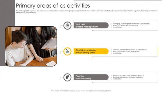 The slide highlights key areas of customer success operations aimed at making major members of customer success functions more effective. It covers tools and process management, data analysis and action with planning and forecasting. Pitch your topic with ease and precision using this Primary Areas Of Cs Activities Background Pdf. This layout presents information on Process, Management, Forecasting. It is also available for immediate download and adjustment. So, changes can be made in the color, design, graphics or any other component to create a unique layout. The slide highlights key areas of customer success operations aimed at making major members of customer success functions more effective. It covers tools and process management, data analysis and action with planning and forecasting.