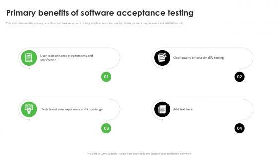 This slide discusses the primary benefits of software acceptance testing which include clear quality criteria, enhance requirements and satisfaction.etc. The best PPT templates are a great way to save time, energy, and resources. Slidegeeks have 100 percent editable powerpoint slides making them incredibly versatile. With these quality presentation templates, you can create a captivating and memorable presentation by combining visually appealing slides and effectively communicating your message. Download Primary Benefits Of Software Acceptance Testing PPT Example from Slidegeeks and deliver a wonderful presentation. This slide discusses the primary benefits of software acceptance testing which include clear quality criteria, enhance requirements and satisfaction.etc.