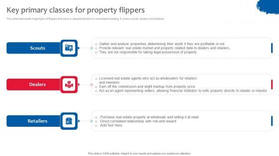 This slide represents major types of flippers that serve a valuable function in real estate investing. It covers scouts, dealers and retailers. Presenting this PowerPoint presentation, titled Key Primary Classes For Property Deploying Effective Property Flipping Strategies Elements Pdf, with topics curated by our researchers after extensive research. This editable presentation is available for immediate download and provides attractive features when used. Download now and captivate your audience. Presenting this Key Primary Classes For Property Deploying Effective Property Flipping Strategies Elements Pdf. Our researchers have carefully researched and created these slides with all aspects taken into consideration. This is a completely customizable Key Primary Classes For Property Deploying Effective Property Flipping Strategies Elements Pdf that is available for immediate downloading. Download now and make an impact on your audience. Highlight the attractive features available with our PPTs. This slide represents major types of flippers that serve a valuable function in real estate investing. It covers scouts, dealers and retailers.