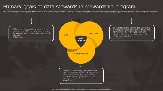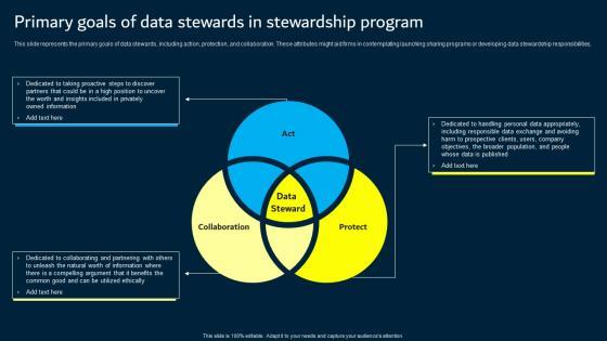 This slide represents the primary goals of data stewards, including action, protection, and collaboration. These attributes might aid firms in contemplating launching sharing programs or developing data stewardship responsibilities. Slidegeeks is here to make your presentations a breeze with Data Governance IT Primary Goals Of Data Stewards In Stewardship Program Structure PDF With our easy to use and customizable templates, you can focus on delivering your ideas rather than worrying about formatting. With a variety of designs to choose from, you are sure to find one that suits your needs. And with animations and unique photos, illustrations, and fonts, you can make your presentation pop. So whether you are giving a sales pitch or presenting to the board, make sure to check out Slidegeeks first.