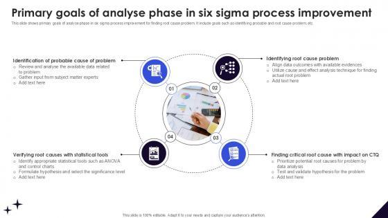 This slide shows primary goals of analyse phase in six sigma process improvement for finding root cause problem. It include goals such as identifying probable and root cause problem, etc. Get a simple yet stunning designed Primary Goals Of Analyse Phase In Lean Six Sigma In Manufacturing Ppt Sample. It is the best one to establish the tone in your meetings. It is an excellent way to make your presentations highly effective. So, download this PPT today from Slidegeeks and see the positive impacts. Our easy-to-edit Primary Goals Of Analyse Phase In Lean Six Sigma In Manufacturing Ppt Sample can be your go-to option for all upcoming conferences and meetings. So, what are you waiting for Grab this template today. This slide shows primary goals of analyse phase in six sigma process improvement for finding root cause problem. It include goals such as identifying probable and root cause problem, etc.