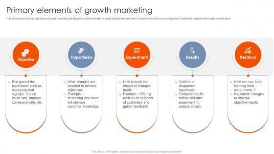 This slide covers the key attributes of growth marketing strategy to enable marketer to understand and implement. It include elements such as objective, hypothesis, experiment, results and iteration. Are you in need of a template that can accommodate all of your creative concepts This one is crafted professionally and can be altered to fit any style. Use it with Google Slides or PowerPoint. Include striking photographs, symbols, depictions, and other visuals. Fill, move around, or remove text boxes as desired. Test out color palettes and font mixtures. Edit and save your work, or work with colleagues. Download Best Practices For Using Growth Primary Elements Of Growth Marketing MKT SS V and observe how to make your presentation outstanding. Give an impeccable presentation to your group and make your presentation unforgettable. This slide covers the key attributes of growth marketing strategy to enable marketer to understand and implement. It include elements such as objective, hypothesis, experiment, results and iteration.