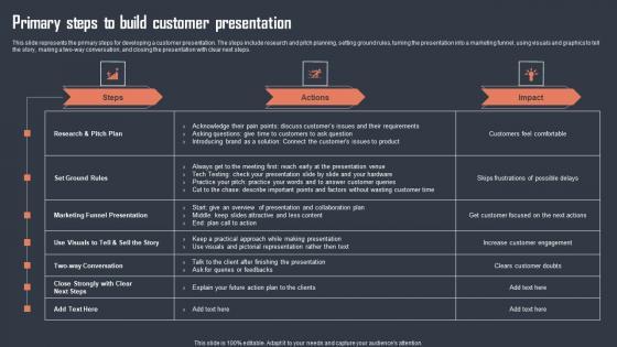This slide represents the primary steps for developing a customer presentation. The steps include research and pitch planning, setting ground rules, turning the presentation into a marketing funnel, using visuals and graphics to tell the story, making a two-way conversation, and closing the presentation with clear next steps. Showcasing this set of slides titled Primary Steps To Build Customer Presentation Diagrams Pdf. The topics addressed in these templates are Steps, Actions, Impact. All the content presented in this PPT design is completely editable. Download it and make adjustments in color, background, font etc. as per your unique business setting. This slide represents the primary steps for developing a customer presentation. The steps include research and pitch planning, setting ground rules, turning the presentation into a marketing funnel, using visuals and graphics to tell the story, making a two-way conversation, and closing the presentation with clear next steps.