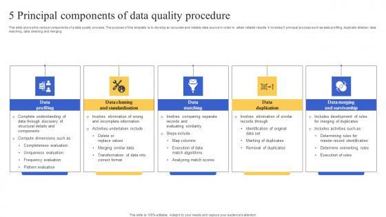 This slide shows the various components of a data quality process. The purpose of this template is to develop an accurate and reliable data source in order to attain reliable results. It includes 5 principal process such as data profiling, duplicate deletion data matching, data cleaning and merging. Pitch your topic with ease and precision using this 5 Principal Components Of Data Quality Procedure Infographics Pdf. This layout presents information on Data Profiling, Data Matching, Data Duplication, Data Merging And Survivorship. It is also available for immediate download and adjustment. So, changes can be made in the color, design, graphics or any other component to create a unique layout. This slide shows the various components of a data quality process. The purpose of this template is to develop an accurate and reliable data source in order to attain reliable results. It includes 5 principal process such as data profiling, duplicate deletion data matching, data cleaning and merging.