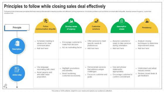 Following slide showcases principles that help sales professionals to develop positive and efficient closing experience. It includes pointers such as follow communication etiquette, develop sense of urgency, customize solutions, etc. Slidegeeks has constructed Closing Techniques To Seal Principles To Follow While Closing Sales Deal SA SS V after conducting extensive research and examination. These presentation templates are constantly being generated and modified based on user preferences and critiques from editors. Here, you will find the most attractive templates for a range of purposes while taking into account ratings and remarks from users regarding the content. This is an excellent jumping-off point to explore our content and will give new users an insight into our top-notch PowerPoint Templates. Following slide showcases principles that help sales professionals to develop positive and efficient closing experience. It includes pointers such as follow communication etiquette, develop sense of urgency, customize solutions, etc.