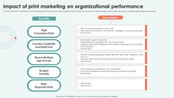 This slide exhibits the advantages of print marketing that help to drive sales. Major benefits covered are high conversion rate, creates credibility, reach multiple age groups, budget-friendly and high response rate. Are you in need of a template that can accommodate all of your creative concepts This one is crafted professionally and can be altered to fit any style. Use it with Google Slides or PowerPoint. Include striking photographs, symbols, depictions, and other visuals. Fill, move around, or remove text boxes as desired. Test out color palettes and font mixtures. Edit and save your work, or work with colleagues. Download Impact Of Print Marketing On Organizational Performance Ppt Model Show PDF and observe how to make your presentation outstanding. Give an impeccable presentation to your group and make your presentation unforgettable.