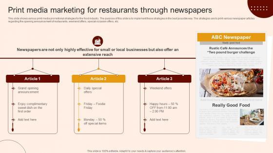 This slide shows various print media promotional strategies for the food industry. The purpose of this slide is to implement these strategies in the best possible way. The strategies are to print various newspaper articles regarding the opening announcement of restaurants, weekend offers, special occasion offers, etc. Find a pre-designed and impeccable Print Media Marketing For Restaurants Through Newspapers Create An Effective Restaurant. The templates can ace your presentation without additional effort. You can download these easy-to-edit presentation templates to make your presentation stand out from others. So, what are you waiting for Download the template from Slidegeeks today and give a unique touch to your presentation. This slide shows various print media promotional strategies for the food industry. The purpose of this slide is to implement these strategies in the best possible way. The strategies are to print various newspaper articles regarding the opening announcement of restaurants, weekend offers, special occasion offers, etc.