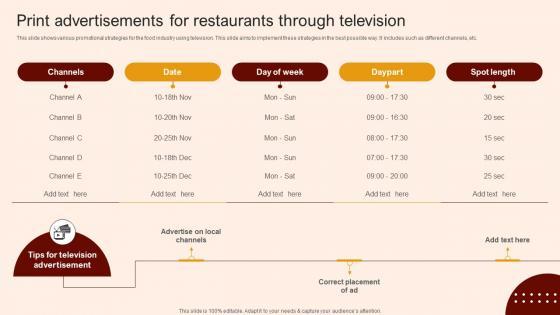 This slide shows various promotional strategies for the food industry using television. This slide aims to implement these strategies in the best possible way. It includes such as different channels, etc. Take your projects to the next level with our ultimate collection of Create A Restaurant Marketing Plan For Print Advertisements For Restaurants. Slidegeeks has designed a range of layouts that are perfect for representing task or activity duration, keeping track of all your deadlines at a glance. Tailor these designs to your exact needs and give them a truly corporate look with your own brand colors they will make your projects stand out from the rest This slide shows various promotional strategies for the food industry using television. This slide aims to implement these strategies in the best possible way. It includes such as different channels, etc.