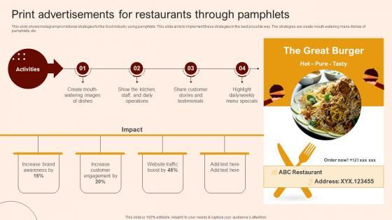 This slide shows Instagram promotional strategies for the food industry using pamphlets. This slide aims to implement these strategies in the best possible way. The strategies are create mouth watering menu dishes of pamphlets, etc. Find a pre-designed and impeccable Create A Restaurant Marketing Plan Print Advertisements For Restaurants Through. The templates can ace your presentation without additional effort. You can download these easy-to-edit presentation templates to make your presentation stand out from others. So, what are you waiting for Download the template from Slidegeeks today and give a unique touch to your presentation. This slide shows Instagram promotional strategies for the food industry using pamphlets. This slide aims to implement these strategies in the best possible way. The strategies are create mouth watering menu dishes of pamphlets, etc.