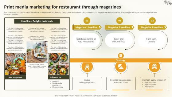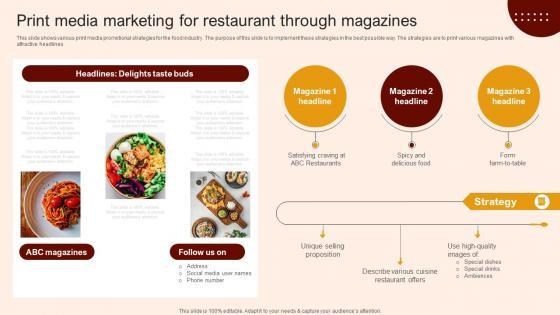 This slide shows various print media promotional strategies for the food industry. The purpose of this slide is to implement these strategies in the best possible way. The strategies are to print various magazines with. Do you know about Slidesgeeks Print Media Marketing For Restaurant Through Magazines Create An Effective Restaurant These are perfect for delivering any kind od presentation. Using it, create PowerPoint presentations that communicate your ideas and engage audiences. Save time and effort by using our pre-designed presentation templates that are perfect for a wide range of topic. Our vast selection of designs covers a range of styles, from creative to business, and are all highly customizable and easy to edit. Download as a PowerPoint template or use them as Google Slides themes. This slide shows various print media promotional strategies for the food industry. The purpose of this slide is to implement these strategies in the best possible way. The strategies are to print various magazines with.