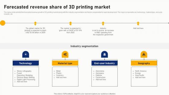 The below slide exhibits the forecasted revenue growth of 3D printing market along with the industry segmentation and factors responsible for rapid development. The major components are technology, material type, end-user industry, etc. Pitch your topic with ease and precision using this Forecasted Revenue Share Of 3D Printing Market Ideas Pdf. This layout presents information on Technology, Material Type, Geography. It is also available for immediate download and adjustment. So, changes can be made in the color, design, graphics or any other component to create a unique layout. The below slide exhibits the forecasted revenue growth of 3D printing market along with the industry segmentation and factors responsible for rapid development. The major components are technology, material type, end-user industry, etc.