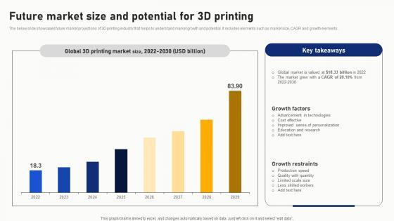 The below slide showcases future market projections of 3D printing industry that helps to understand market growth and potential. It includes elements such as market size, CAGR and growth elements. Showcasing this set of slides titled Future Market Size And Potential For 3D Printing Brochure Pdf. The topics addressed in these templates are Future Market Size, Potential. All the content presented in this PPT design is completely editable. Download it and make adjustments in color, background, font etc. as per your unique business setting. The below slide showcases future market projections of 3D printing industry that helps to understand market growth and potential. It includes elements such as market size, CAGR and growth elements.