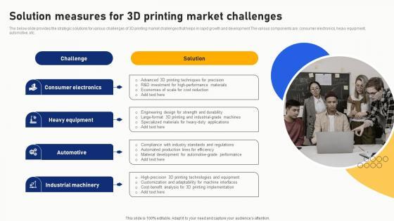 The below slide provides the strategic solutions for various challenges of 3D printing market challenges that helps in rapid growth and development The various components are consumer electronics, heavy equipment, automotive, etc. Showcasing this set of slides titled Solution Measures For 3D Printing Market Challenges Slides Pdf. The topics addressed in these templates are Consumer Electronics, Heavy Equipment, Automotive. All the content presented in this PPT design is completely editable. Download it and make adjustments in color, background, font etc. as per your unique business setting. The below slide provides the strategic solutions for various challenges of 3D printing market challenges that helps in rapid growth and development The various components are consumer electronics, heavy equipment, automotive, etc.