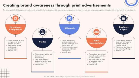 The following slide highlights some methods to promote university for higher education and develop interest among students. It includes elements such as newspapers, guides, billboards, public transportation, brochures, flyers, etc. If you are looking for a format to display your unique thoughts, then the professionally designed Creating Brand Awareness Through Print Advertisements Running Marketing Campaigns Strategy SS V is the one for you. You can use it as a Google Slides template or a PowerPoint template. Incorporate impressive visuals, symbols, images, and other charts. Modify or reorganize the text boxes as you desire. Experiment with shade schemes and font pairings. Alter, share or cooperate with other people on your work. Download Creating Brand Awareness Through Print Advertisements Running Marketing Campaigns Strategy SS V and find out how to give a successful presentation. Present a perfect display to your team and make your presentation unforgettable. The following slide highlights some methods to promote university for higher education and develop interest among students. It includes elements such as newspapers, guides, billboards, public transportation, brochures, flyers, etc.